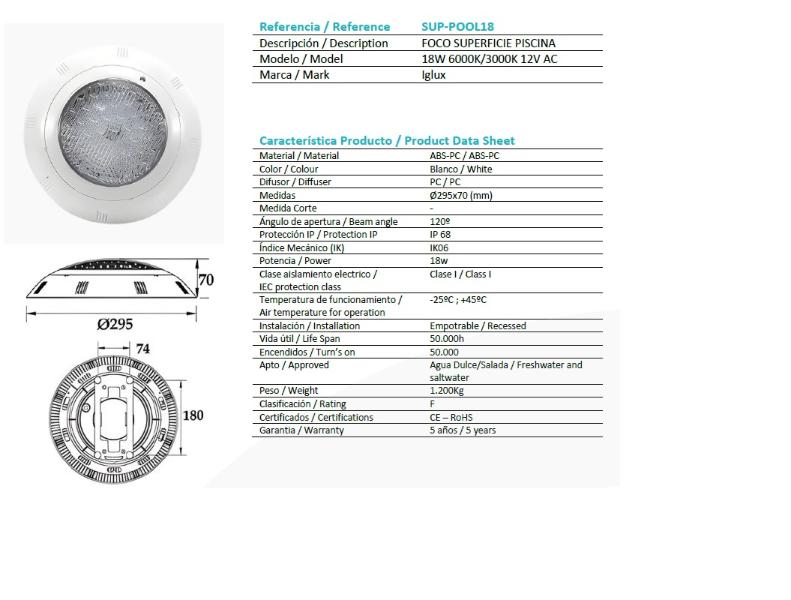 Información Lumínica / Light Info Tipo de CHIP / Led Brand LED Epistar SMD2835 Número de LEDs 252 pcs Color de la luz / Color of light Cálido / Warm Frío / Cold Potencia / Power 18w Temperatura de color / CCT 3000K 6000K Lúmenes / Lumens 1700 lm 1800 lm Efficiencia / Luminous efficiency 100 lm/w CRI 95 Características / data Sheet Tensión de funcionamiento / Operating voltage 12V AC Tensión nominal / Rated input voltage 12V AC Frecuencia / Frequency 50/60 Hz Factor de potencia / Power factor 0.95